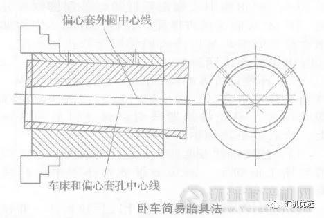 基本同方法一。但需先在卧车加工偏心套内孔,偏心套以孔定位固定于芯轴。芯轴尾座侧孔是按偏心套内外轴线斜角,并根据芯轴长度计算好偏心量而加工。卧车卡、顶芯轴,加工偏心套外圆。