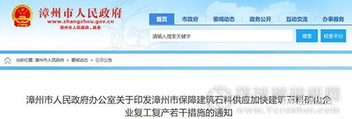 日前,福建省漳州市人民政府印发漳州市保障建筑石料供应加快建筑石料矿山企业复工复产若干措施的通知,要求加快建筑石料矿山企业复工复产,重点项目将协调建筑石料矿山企业定向供应,并给予补贴。